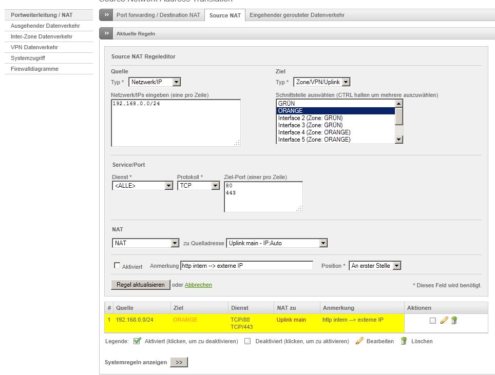 Wow! Danke für die rasche Antwort. Habe mich an Deine Lösung gehalten... Leider kein Erfolg. Hier noch den Prt-Scr von meiner Seite (https://firewall.local:10443/cgi-bin/dnat.cgi):
