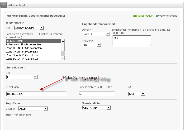 also den Port habe ich so eingestellt, wie du es beschrieben hast ... firewall ist derzeit aus und trotzdem lande ich auf der Endian