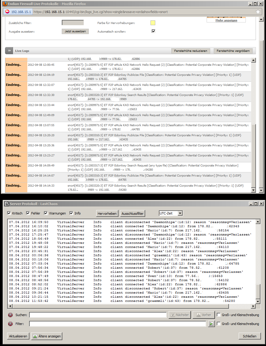 Und zwar betrifft das den eingehenden sowie den ausgehenden Datenverkehr. Es sind nur IPs im Spiel, die auch auf meinem TS Server verbunden sind, soweit ich das beurteilen kann. Aber keiner hat da einen Esel am laufen. Das Problem tritt auch nicht immer auf, nur alle paar Tage schlägt die Eindringlingserkennung an. Dafür dann aber meist etliche male.
