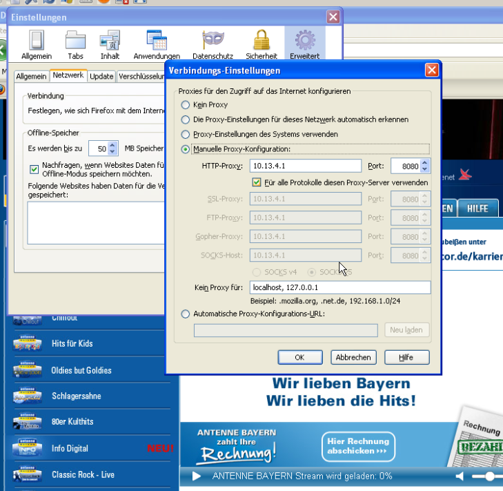 Habe ein Problem mit Webradio-Streams, wenn ich über den http-Proxy gehe. Konkret erscheint beim Aufruf von http://www.webradio.de mittels Mozilla Firefox die Meldung "201 unable to load stream or clip file"