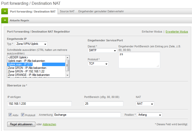 Ich möchte einen Exchange im LAN (Green) betreiben und von extern erreichbar machen.