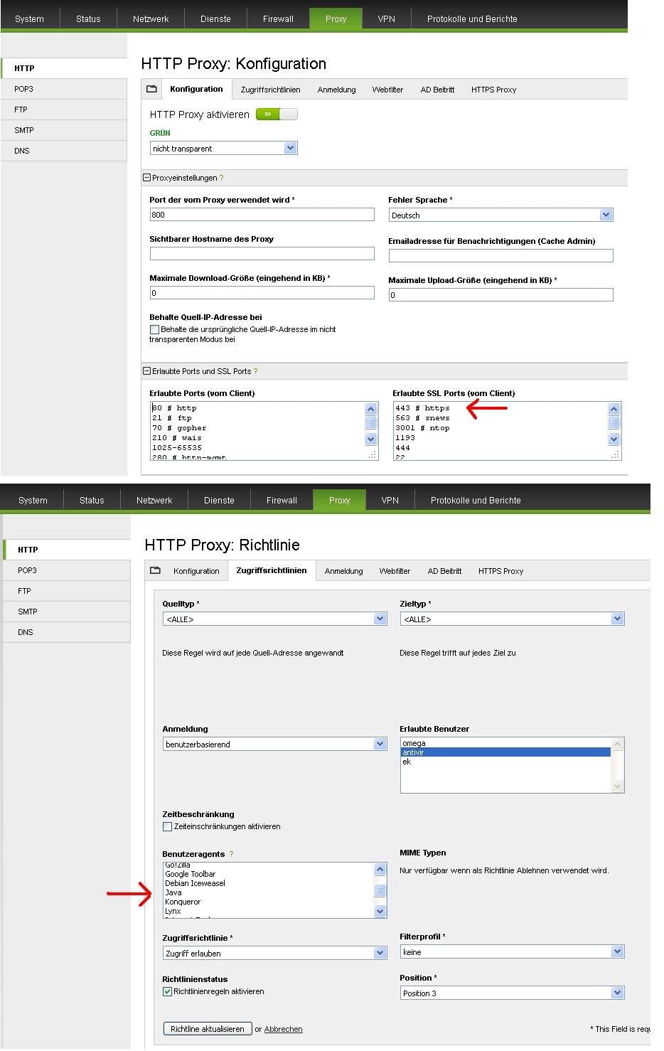 und den LIive-Protokollen (Menü "Protokolle und Berichte" >> mitte/rechts "HTTP-Proxy; nur dieses Protokoll anschauen" >> neues Fenster mit den Protokoll)