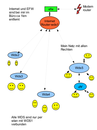 Mein netz müste jetzt wie folgt aussehen: alle Router im WDS brauchen eine feste IP, das grüne interface von der efw natürlich auch.