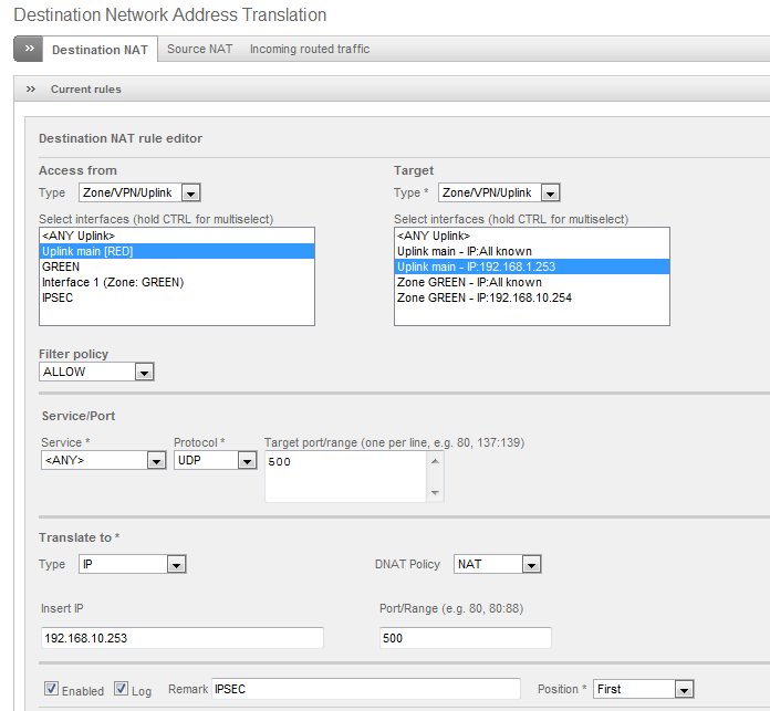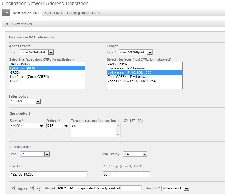 Ich möchte gerne zu einem Router, der sich im grünen Bereich der efw (Endian Firewall Community release 2.3.0) befinden, einen IPSEC verschlüsselten Tunnel aufbauen. Gedacht war, dass die efw die Datenpakete, die für den Aufbau des Tunnel benötigt werden einfach durchroutet. Dies sieht netzwerktechnisch etwa so aus: