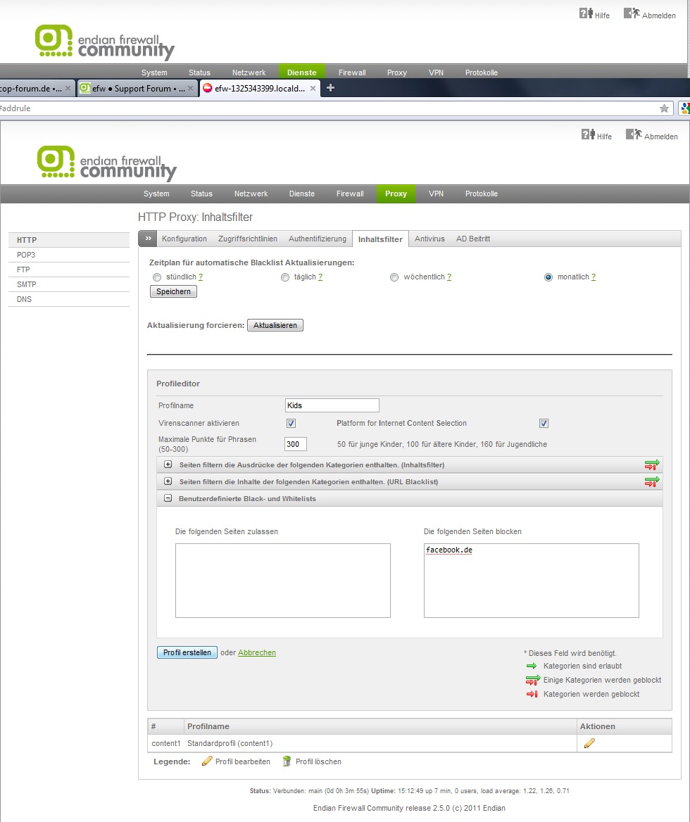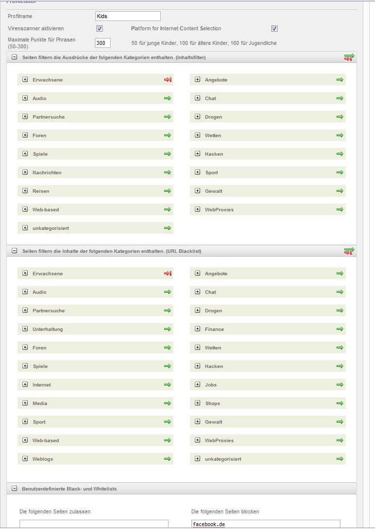 dann unter "Inhaltsfilter" mache ich ein neues Profil und trage unter "blacklists"