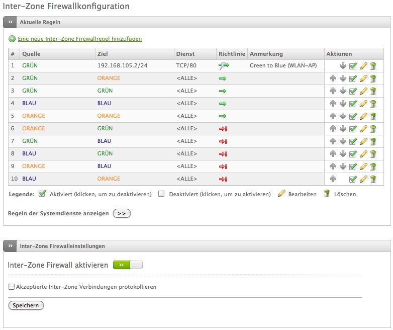 Ich habe eine Endian 2.5.1 im Einsatz. Grüne, Blau und Orangene Zone.