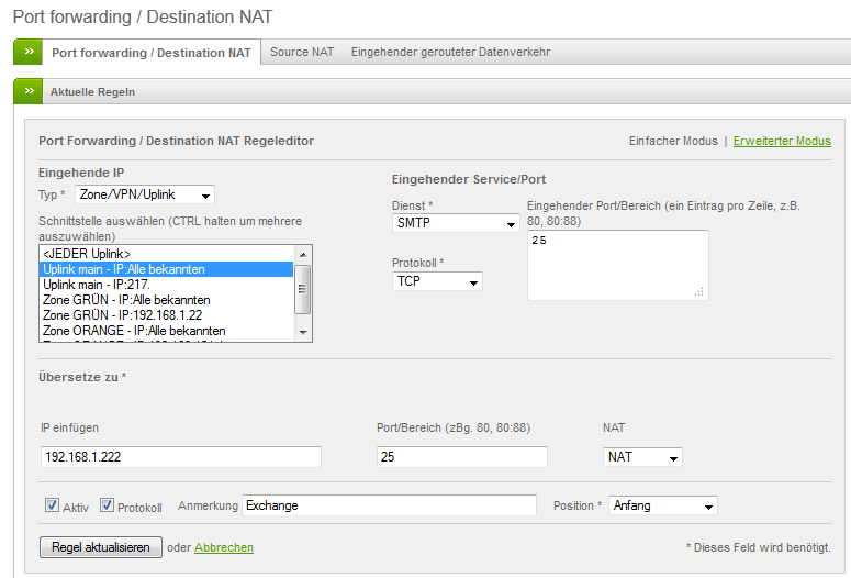 Dann hänge ich den exchange an einen freien Port an der Endian und leite Port 25 SMTP an diesen weiter.