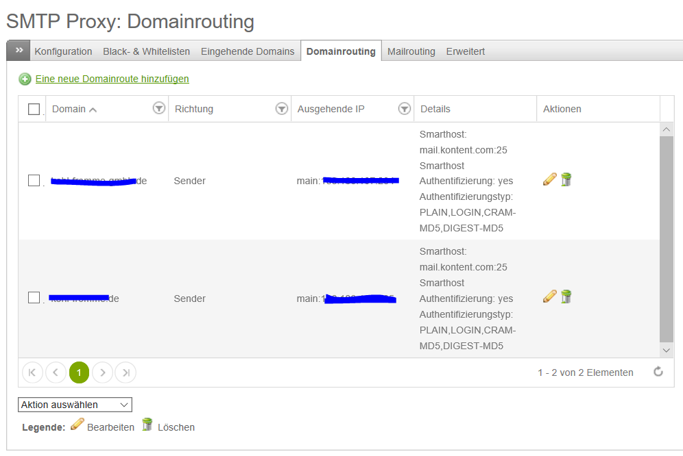 -> Domainrouting beim SMTP-Proxy einrichten, Richtung ist "Senden", Domäne eintragen und den zugehörigen Smarthost eintragen. So klappte es aber leider nicht, es wird scheinbar immer der zweite eingerichtete Smarthost verwendet, der eine Absenderdomäne immer ablehnt. Kennst jemand sowas und hat eine Lösung?
