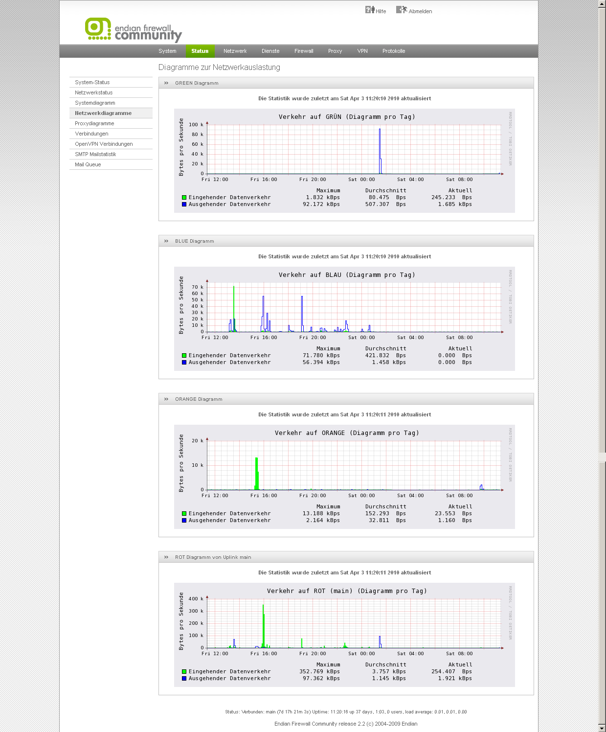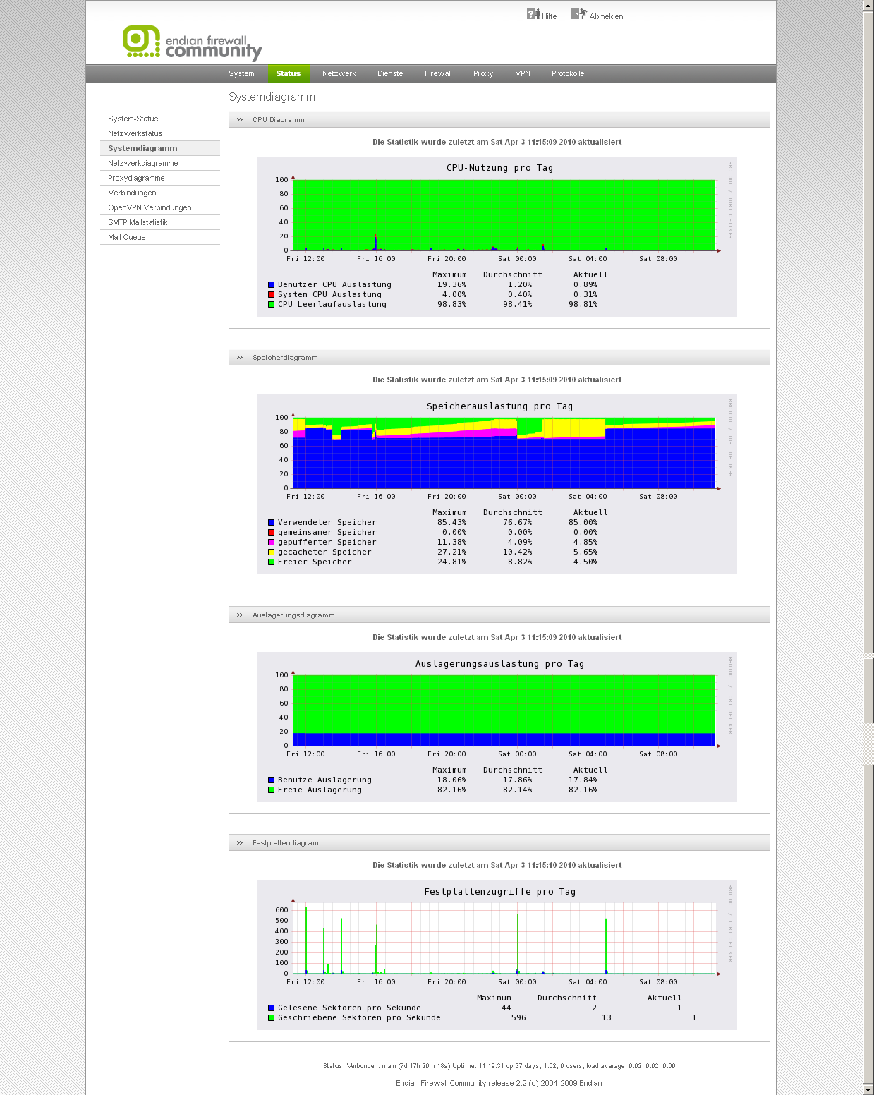 Alles anzeigenCron-Server LÄUFT DHCP Server LÄUFT DNS-Proxyserver LÄUFT Email Scanner (POP3) ANGEHALTEN FTP Viren Scanner ANGEHALTEN HTTP Antivirus (havp) LÄUFT Inhaltsfilter LÄUFT Intrusion Detection System LÄUFT NTP Server LÄUFT OpenVPN Server LÄUFT Protokollierungs-Server LÄUFT Pyzor Spamfilter LÄUFT Secure Shell Server LÄUFT Slproxy ANGEHALTEN Spamfilter für POP3 (spamd) ANGEHALTEN Spamfilter für SMTP (amavis) LÄUFT VPN (IPSec) ANGEHALTEN Viren Scanner LÄUFT Web-Proxy LÄUFT Web-Server LÄUFTMit einem lt. /proc/cpuinfo