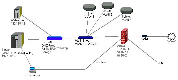 Der Interessante Teil ist, das über [Werte verändert] VLAN 11 mit IP 192.168.1.1 die Astaro über den Switch in die DMZ verbindet, in der der Mailserver und HTTP-Proxy als reiner Router (192.168.1.2) sowie ein Webserver (192.168.1.3) für unsere Arbeitsgruppe hängt. Und genau zwischen Astaro und Mailserver/HTTP-Proxy hätten wir gerne eine Endian für Spam/Antivirus/Contentfilter etc. und möglichst ohne etwas an der Firewall (ganz wichtig, da zentral verwaltet) zu verändern. Die Endian darf dabei gerne unseren Webserver über Orange anbinden... Zur Zeit hängt dort ein einfacher Router...