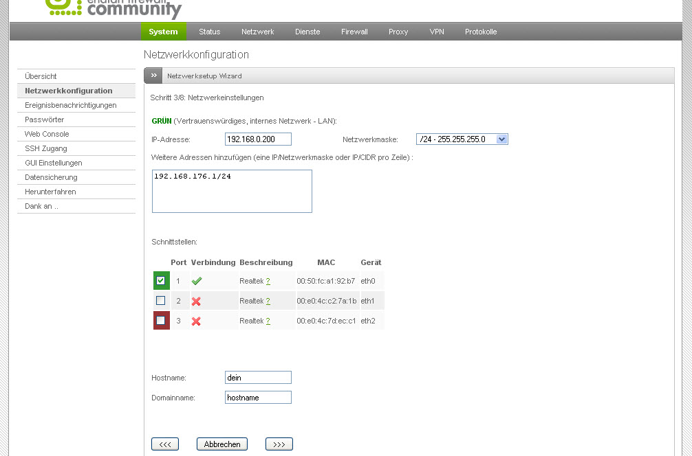 Die Schnittstelle ist nach dem oben genannten Schritt schon in der grünen Zone. In der Console ifconfig eth2 192.168.176.1 eingeben und schon ist diese Karte auch in diesem Netz. Zusätzlich kannst du dann in der Firewall unter Systemzugriff noch einstellen, dass man auf die Firewall nur von diesem Subnetz und eth2 auf die Firewall zugreifen kann. -