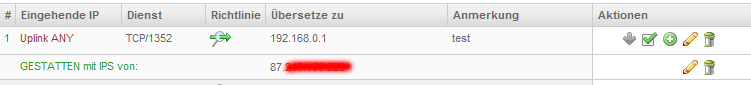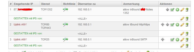 1x Mail: Uplink Any -> TCP/25 -> 192.168.0.1Das ganze funktioniert auch wunderbar.
